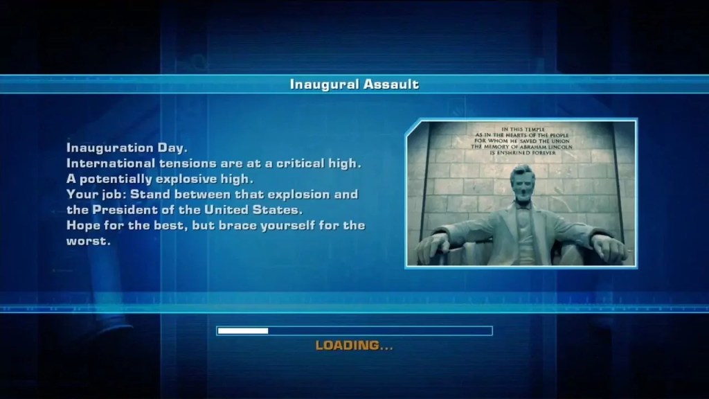 The game starts at the Lincoln Memorial, where the out-going President is making a pilgramge to the famous statue, when bang/whizz/flash, terrorists storm the event and shoot the Prez in the stomach.